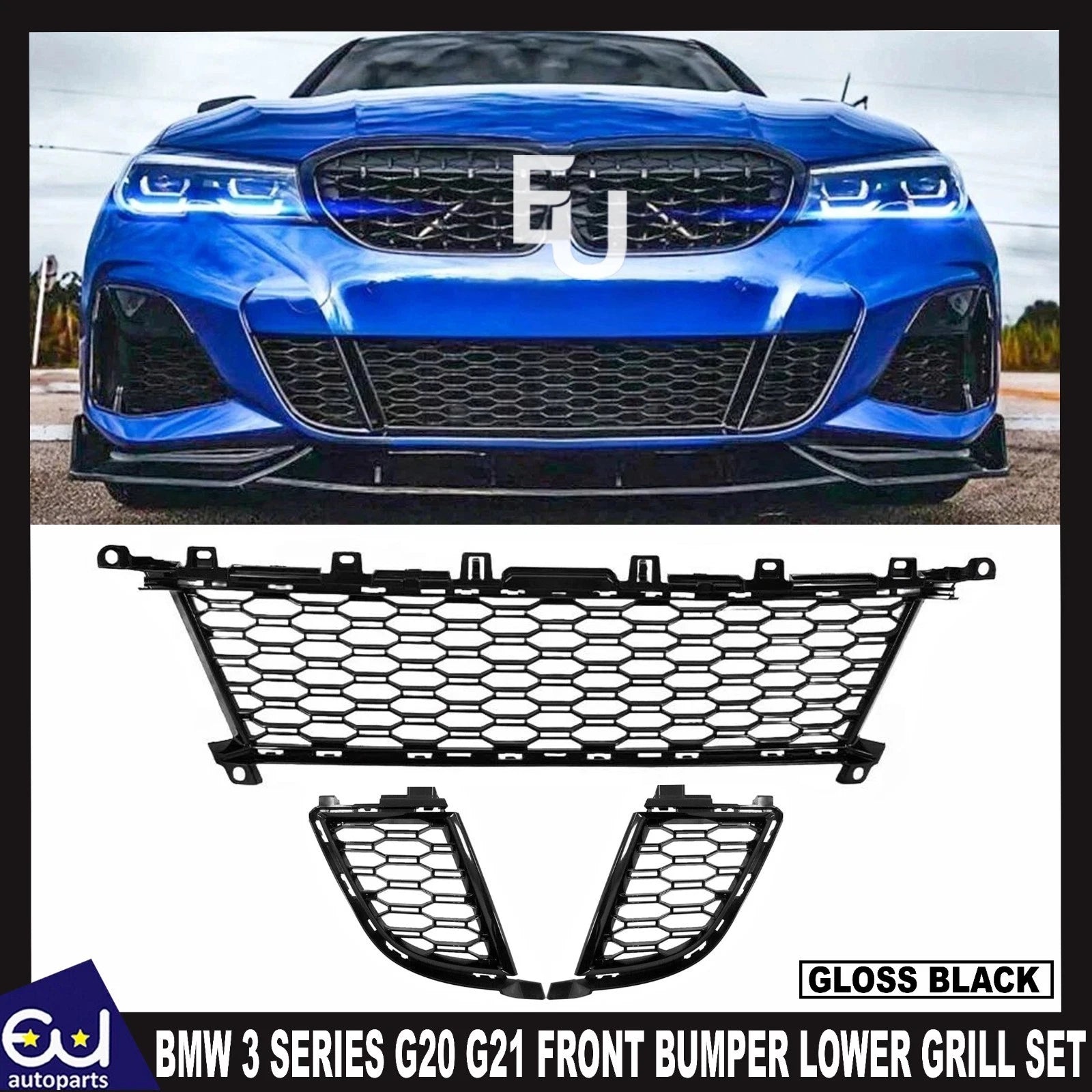 Restore the sporty appearance of your BMW with this Front Bumper Lower&Center Grille Set (Left, Right, Center), designed for BMW 3 Series G20 Sedan and G21 Touring (2019–2022 Pre-LCI).